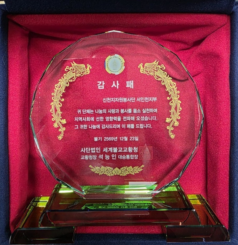 사)세계불교교황청(청장 석능인 스님)은 지난 26일, 지역 사회를 위한 봉사활동으로 이웃사랑을 실천해 온 신천지 자원봉사단 서인천지부에 감사패를 전달했다.