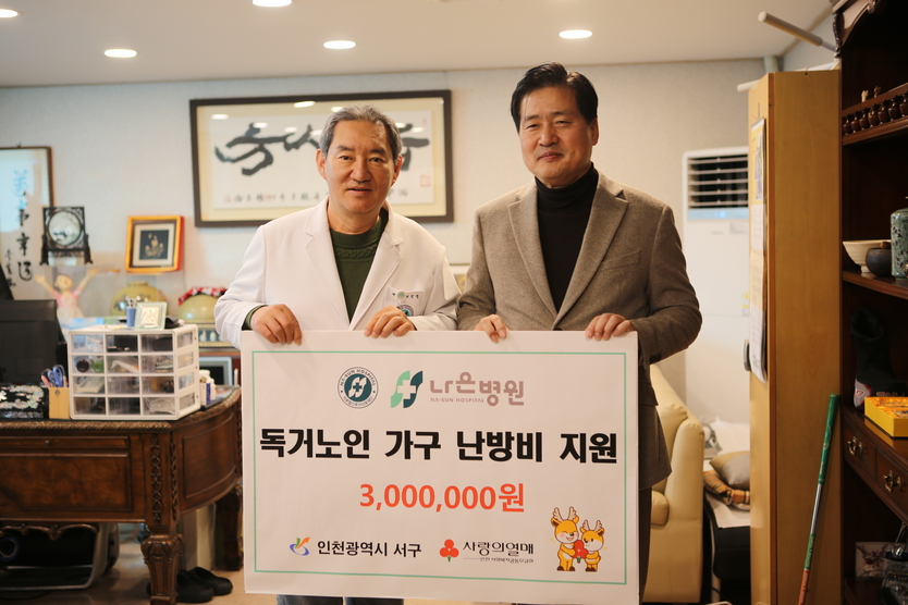 나은병원은 17일, 인천 서구 지역 내 독거노인 가구의 난방비 지원을 위해 300만 원을 기탁했다고 밝혔다. 이번 전달식에는 강범석 인천 서구청장과 하헌영 나은병원장, 사랑의열매 인천사회복지공동모금회 관계자 등이 참석했다.