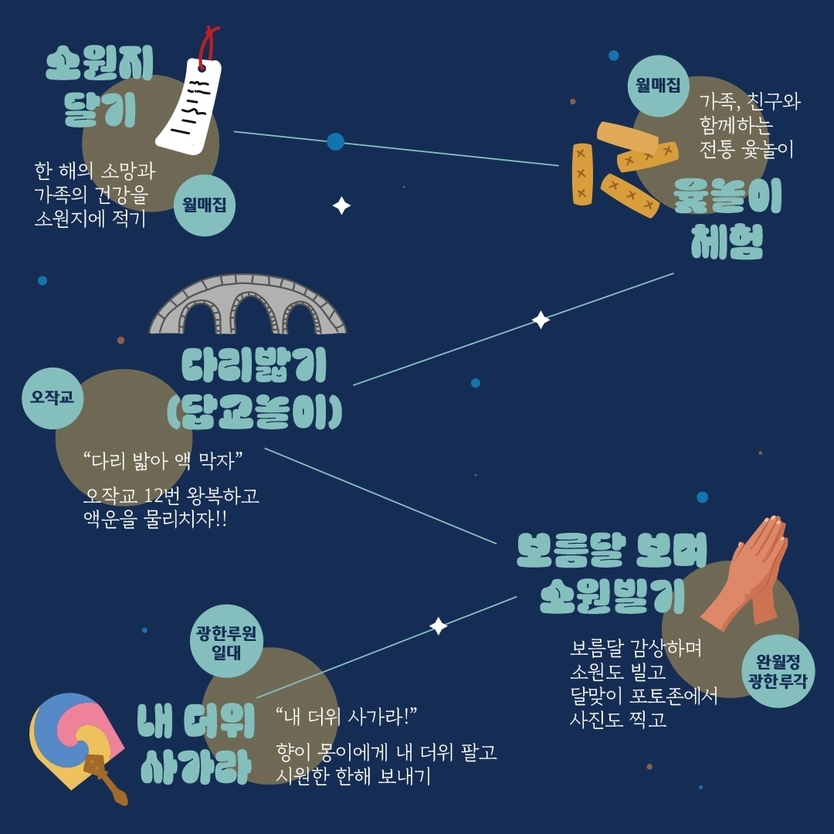 행사는 광한루원 월매집, 오작교, 완월정, 광한루 등 공간의 특성을 살려 구성됐다. 주요 내용은 한 해의 소망을 기원하는 소원지 달기, 가족·친구 단위로 즐기는 윷놀이(윷점)체험, 오작교를 건너며 액운을 막는 다리밟기(답교놀이), 보름달을 보며 소원을 비는 달맞이 프로그램, 전통 풍속을 재현한 ‘내 더위 사가라’(더위팔기), 한 해의 건강과 안녕을 기원하는 부럼깨기 체험 등이다.