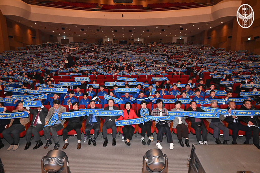 인천유나이티드가 22일 인천 IGC글로벌캠퍼스 대강당에서 ‘2026시즌 출정식’을 개최하고, 홈 개막전을 향한 본격적인 행보를 시작했다. 이번 행사는 티켓 오픈 이틀 만에 전석이 매진될 만큼 팬들의 뜨거운 관심을 모았으며, 현장에는 1,400여 명의 팬이 운집해 대강당을 ‘검파(검정·파랑)’ 물결로 가득 메웠다.