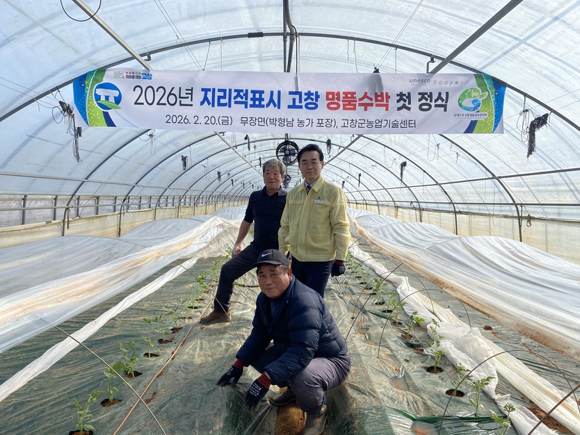 고창군은 지난 20일 무장면 박형남 농가 수박 재배포장에서 관계자와 농업인 등이 참석한 가운데 ‘2026년 지리적표시 고창 명품수박 첫 정식 행사’를 개최했다고 밝혔다.