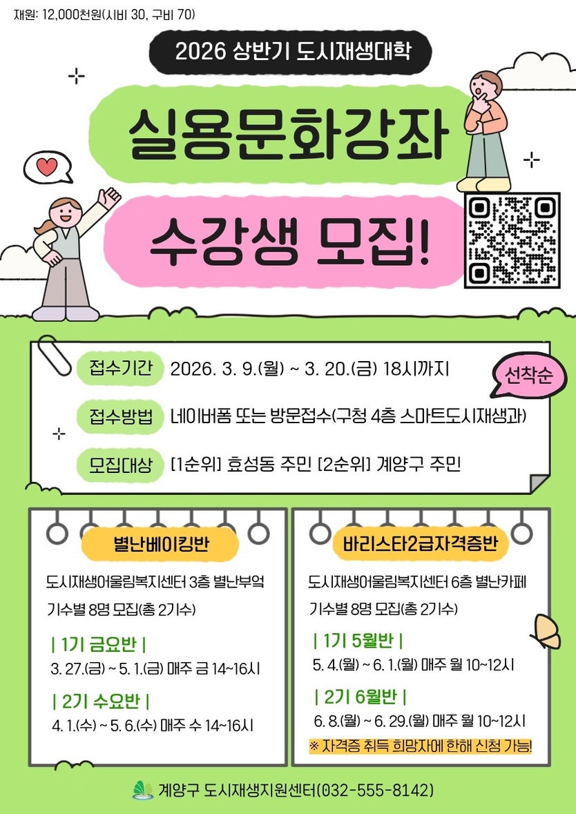 【우리일보 인천=최은준 기자】인천시 계양구가 오는 3월 9일부터 20일까지 ‘2026년 상반기 도시재생대학 실용·문화강좌’ 수강생을 선착순으로 모집하며 지역 활력 제고에 나선다.