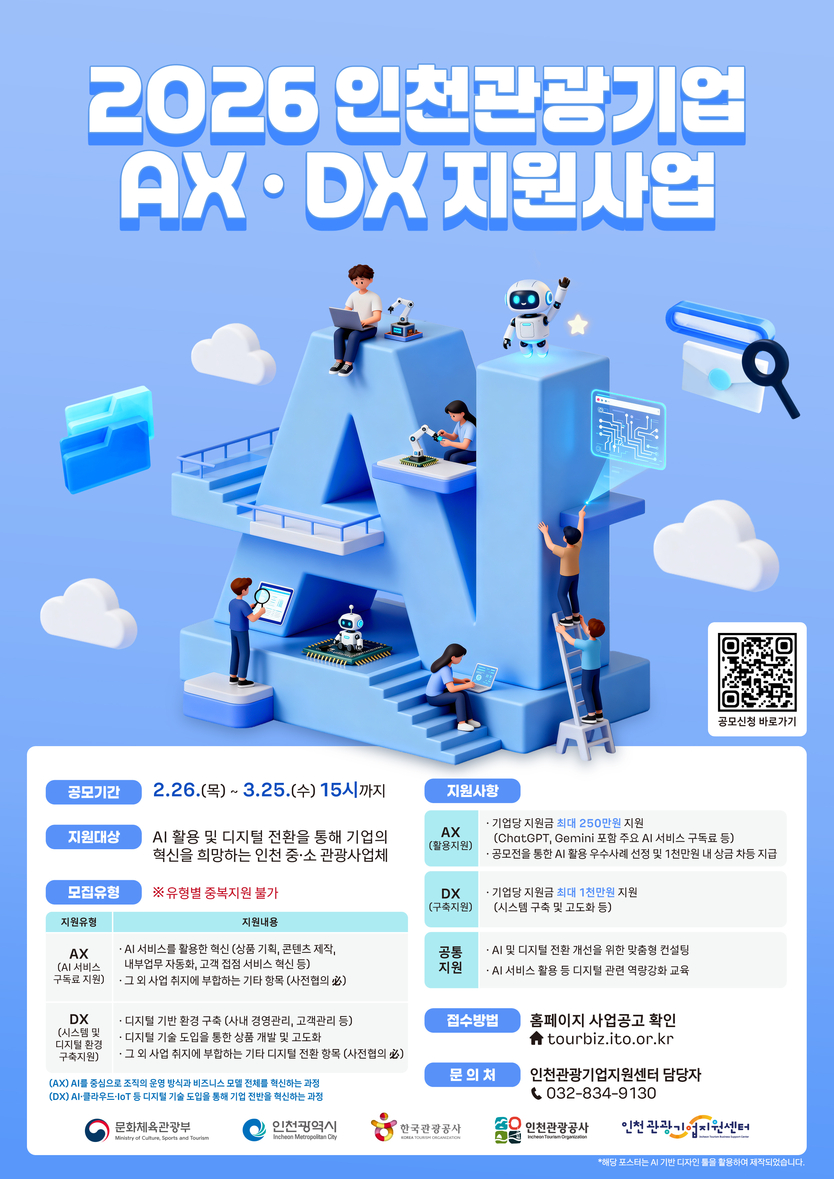 지원 규모 및 혜택이번 공모를 통해 총 17개사를 선발하며, 지원 내용은 다음과 같다.구분지원 규모지원 내용최대 지원금AX 지원15개사AI 서비스 구독료 및 활용 지원기업별 250만 원DX 지원2개사시스템 구축 및 디지털 고도화기업별 1,000만 원선정된 기업에는 지원금 외에도 인천관광기업지원센터가 제공하는 ▲디지털 역량 강화 교육 ▲맞춤형 전문가 컨설팅 등 다각적인 후속 프로그램이 제공된다.김태현 인천관광공사 관광산업실장 한마디"올해는 인천 관광기업이 AI를 본격적으로 실무에 도입하는 첫해인 만큼, 이번 사업이 실질적인 경영 혁신과 성장을 이루는 마중물이 되길 기대한다.