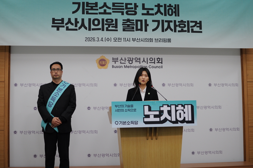 【우리일보 김지윤 기자】 기본소득당 노치혜 여성위원장이 4일 오전 부산광역시의회 브리핑룸에서 기자회견을 열고 제9회 지방선거 부산시의회 비례대표 출마를 공식 선언했다. 노 후보는 1997년생으로 성신여대 경영학과를 졸업하고 현재 논스파운데이션 엔지니어로 활동 중인 20대 IT 전문가다. 그는 "AI 수도 부산의 첫 번째 시의원이자 일당백 시의원이 되어 산업 혁신의 성과를 보통 시민의 삶의 변화로 이어지게 하겠다"며 출사표를 던졌다.