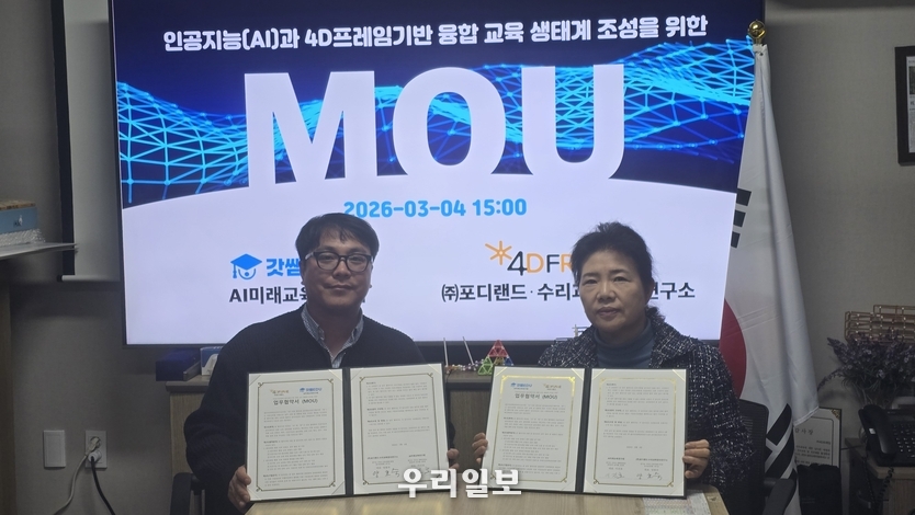 【우리일보 김지윤 기자】 AI미래교육연구회(회장 이건호)와 (주)포디랜드·수리과학창의연구소(대표 양효숙)가 4일 교육 현장의 인공지능(AI) 및 4D프레임 융합 교육 생태계 조성을 위한 업무협약(MOU)을 체결했다. 이번 협약은 상호 신뢰를 바탕으로 혁신적인 미래 교육을 실현하고, 교육 콘텐츠 제작 및 연수·자료 개발 협력을 추진하기 위해 마련됐다. 양 기관은 디지털 전환이라는 거대한 파고 속에서 공교육의 본질을 지키며 변화에 대응하기 위해 손을 잡았다.