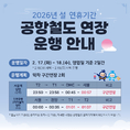 【우리일보 인천=구광회 기자】2026년 설 연휴, 심야 시간대 공항철도를 이용하는 시민들의 귀갓길이 한층 편리해질 전망이다. 공항철도(주)는 설 연휴 기간 증가하는 해외여행객과 귀경객의 이동 편의를 위해 설 당일인 2월 17일과 다음 날인 18일, 이틀간 막차 운행 구간을 연장한다고 10일 밝혔다.▲디지털미디어시티역 → 서울역까지 연장기존 인천공항2터미널(T2)역에서 23시 50분에 출발해 디지털미디어시티(DMC)역까지만 운행하던 막차는 이번 연장 조치를 통해 서울역까지 연장 운행한다. 해당 열차의 서울역 도착 시각은 다음 날 오전 0시 57분이다.▲ 하행(인천공항 방향): 검암역 → 인천공항2터미널역까지 연장기존 서울역에서 자정(00시)에 출발해 검암역에서 멈추던 하행 막차 역시 인천공항2터미널(T2)역까지 구간을 늘려 운행한다. 종착역인 인천공항2터미널역 도착 시각은 다음 날 오전 1시 7분이다.공항철도 관계자는 "올해 설 연휴는 해외여행 수요와 귀경 수요가 동시에 몰릴 것으로 예상된다"며 "심야 시간대 이용객들이 대중교통 이용에 불편함이 없도록 안전 운행에 만전을 기하겠다"고 전했다.